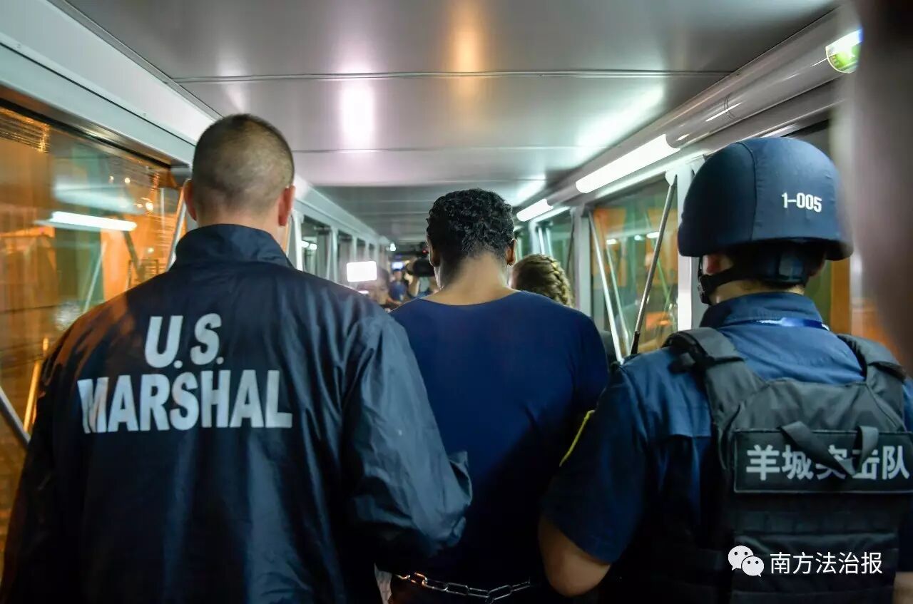 中美双方执法人员共同将美籍红通逃犯弗格森·纳坤押解登机。